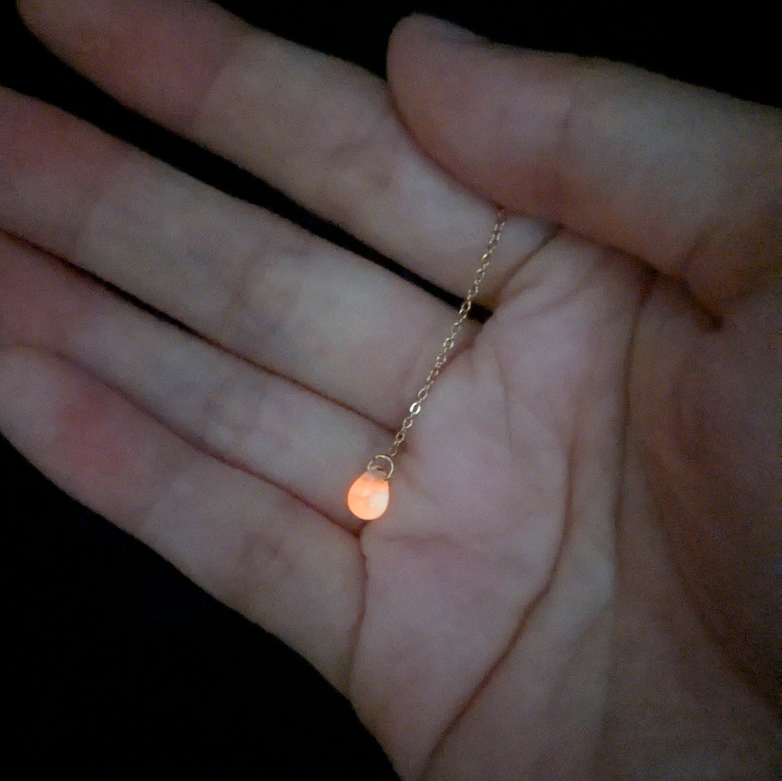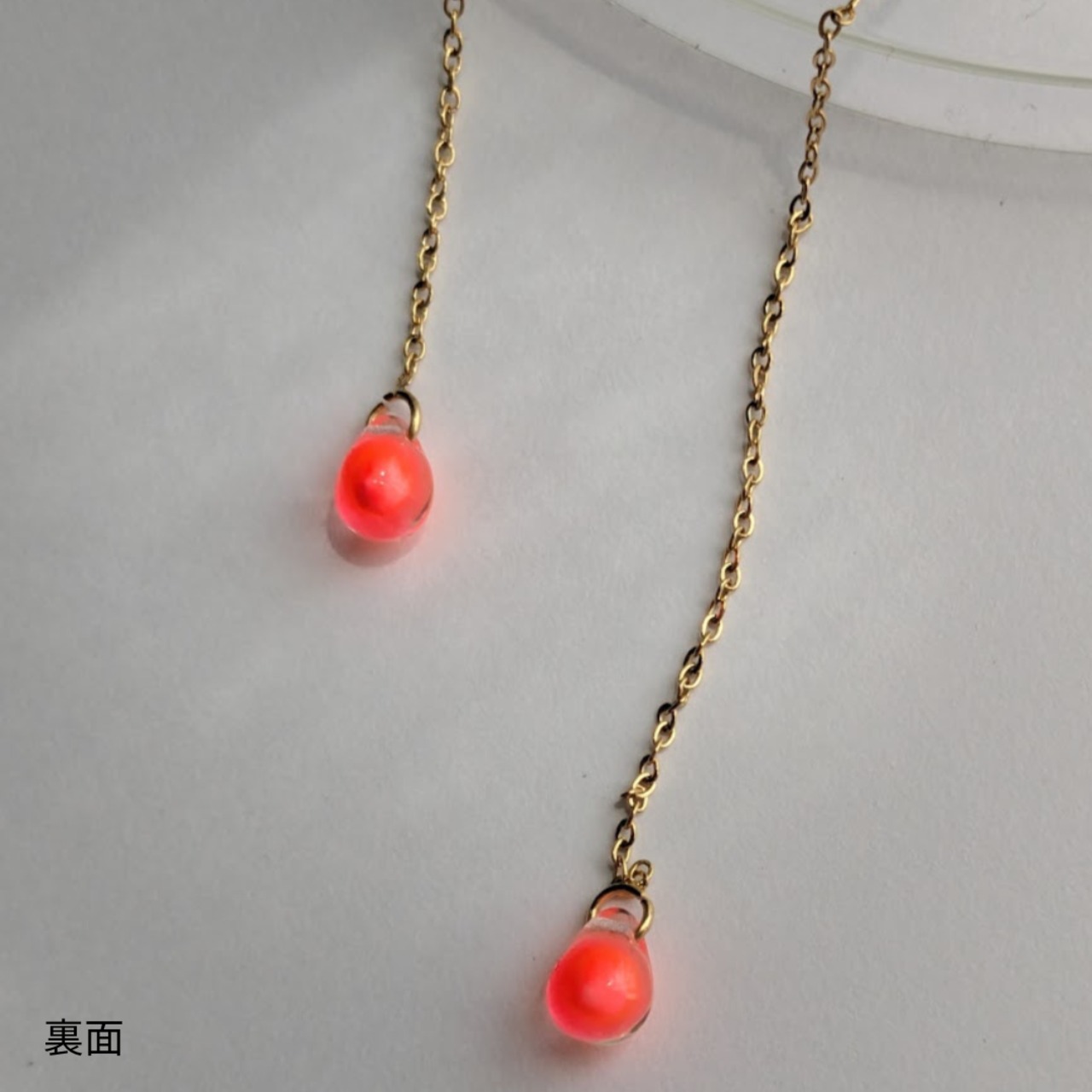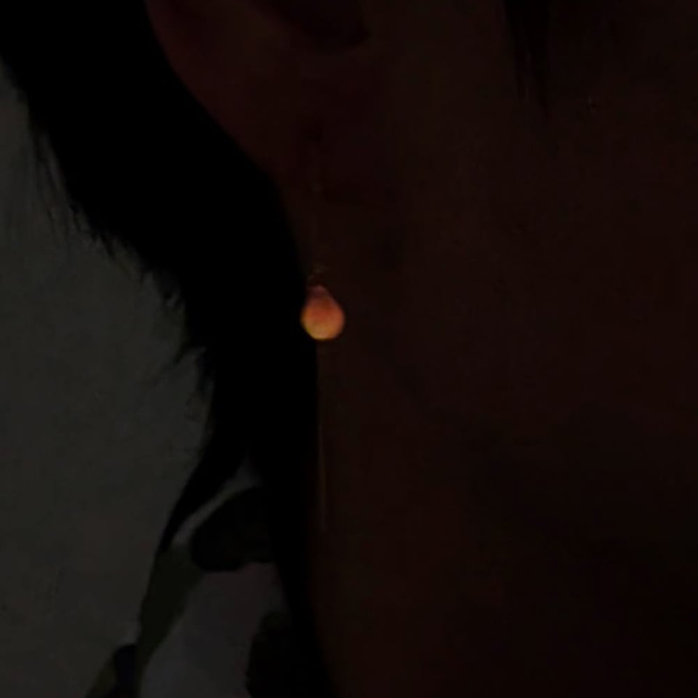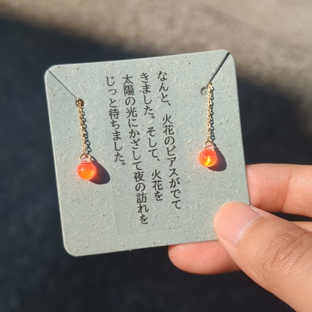 さらにこのピアスには秘密があって、太陽の光にかざしてから暗いところに行くと本物の線香花火の火花のように灯ります。